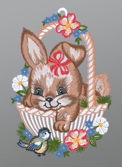 25,45 EURFensterbild aus Plauener Spitze® - Kleine Häsin in Osterkörbchen #1W mehrfarbig