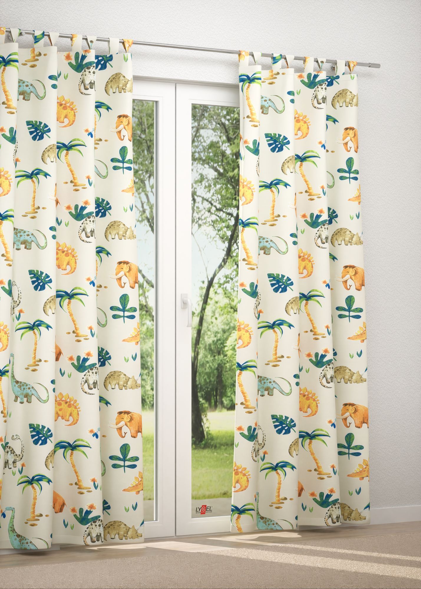 Eine Reise in eine Zeit vor Millionen Jahren. Dieser Stoff zeigt eine fantastisch-bunte Haminasaurierwelt, die Ihr Kind ganz spielerisch an die unvergesslichen, imposanten Tiere heranführt. Die Fleisch- und Pflanzenfresser lächeln leicht und der Langhals-Saurier lässt sich seine Blätter schmecken. Die Palmen und die anderen Pflanzengewächse lassen das Design zusammen mit dem hellen Hintergrund beinahe tropisch aussehen. Fantasievoll und fröhlich wirkt es insgesamt, die bunten Farben sorgen direkt für gute Laune. Da der Stoff auch als Meterware erhältlich ist, können Sie daraus auch selbst individuelle Accessoires für Ihr Zuhause schneidern. Für eine Fensterdeko nach Maß, etwa einen Gardinenschal oder ein Raffrollo, nutzen Sie den Konfigurator. Das glatte, lichtdurchlässige Polyestergewebe mit Transferdruck ist lichtdurchlässig, sorgt für ein helles und freundliches Ambiente. Gleichzeitig bleibt die Privatsphäre stets gewahrt.