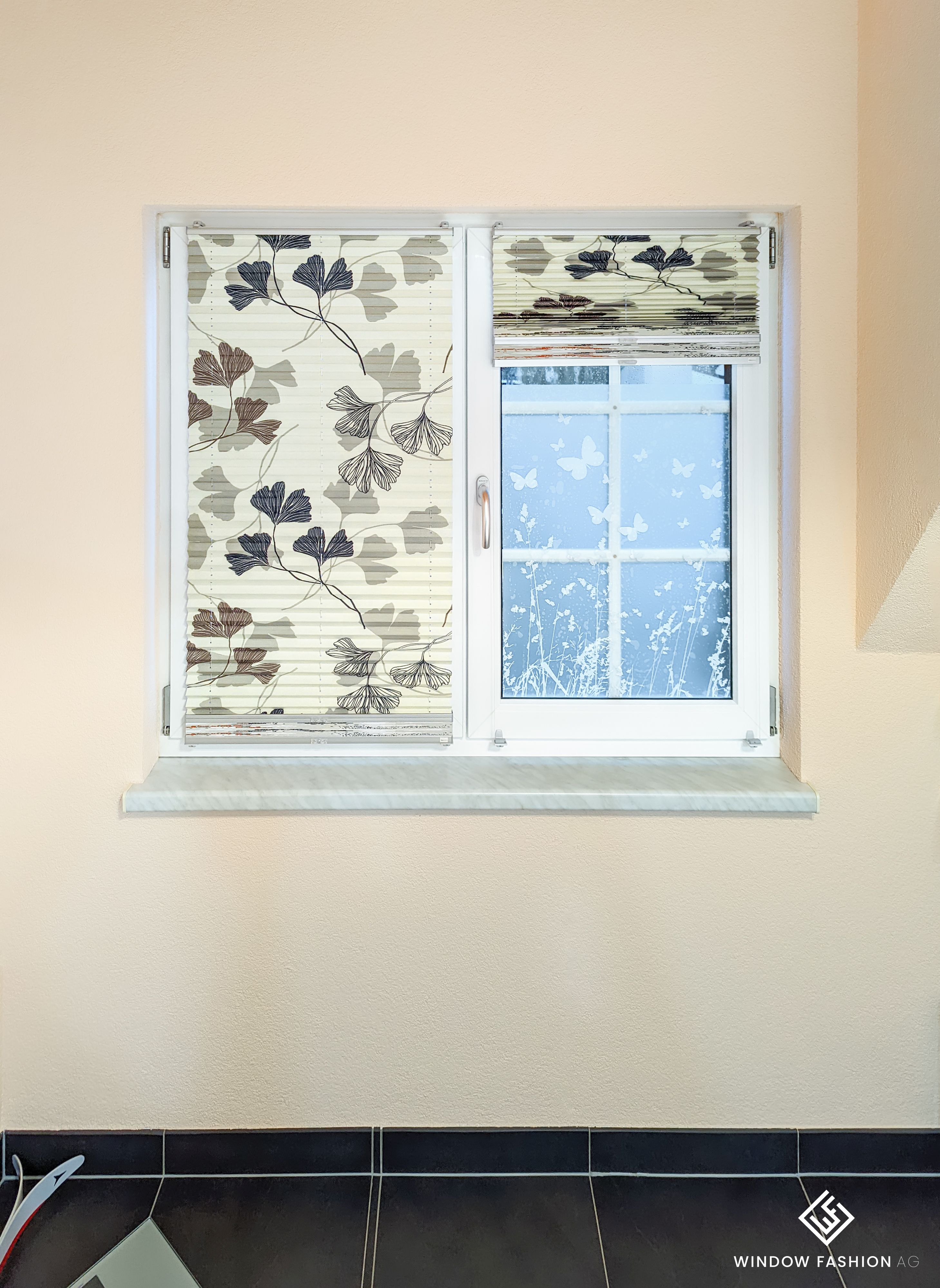 Dekorative Ginkgoblätter in harmonischen Schattierungen einer Farbfamilie zieren die Vorderseite dieses Plissees. Die Rückseite ist mit einer weißen, reflektierenden Schicht versehen, die einen optimalen Sonnenschutz bietet. Neugierige Blicke kommen durch den verdunkelnden Stoff ebenso wenig hindurch wie blendende Sonnenstrahlen. Somit ist dieses Modell die beste Wahl für die Fensterdeko im Schlaf- und Kinderzimmer sowie im Arbeitszimmer. Dort leistet das Plissee als Blendschutz für den Bildschirm hervorragende Dienste. Profitieren Sie in Ihren Räumen, vor allem im Dachgeschoss und im Wintergarten, auch von dem praktischen Wärmeschutz. Im Sommer tragen die temperaturregulierenden Eigenschaften des Plissees dazu bei, dass sich Räume weniger schnell aufheizen, im Winter hingegen bleibt die Wärme länger bewahrt. Beides senkt die Energiekosten. Dieser Plisseestoff zeigt sich in einer ganz speziellen Weißnuance. Durch den sandigen Grundton strahlt Perlweiß Wärme und Wohnlichkeit aus und die abgebildeten Ginkgo-Blätter, vornehmlich in kühlem Blaugrau, aber auch in Violett, kommen besonders gut zur Geltung. Das umherschweifende Auge wird auf angenehme Weise von dem Design angezogen, wobei sich das Plissee spielend-leicht und behutsam in die umgebende Raumgestaltung einfügt.
