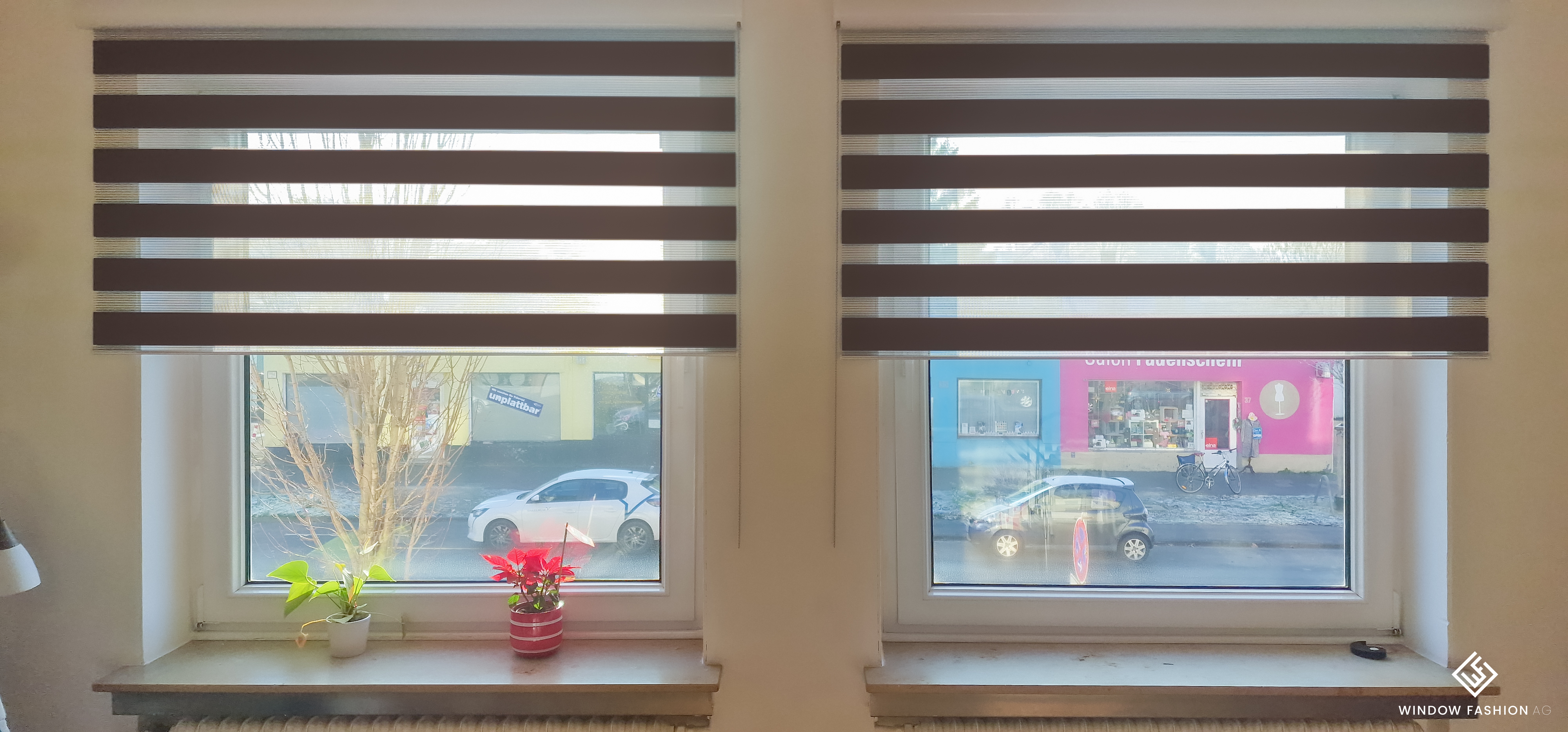 Ein Rollo für alle Fälle sieht in etwa so aus. Doppelrollos sind besonders flexibel in ihren Einsatzmöglichkeiten und schaffen eine individuelle Stimmung. Ganz nach Belieben können Sie den Kettenzug bedienen und die Lichtverhältnisse ändern, bzw. anpassen. Die transparenten und blickdichten Stoffstreifen sind im Wechsel angeordnet. Liegen beide Stoffbahnen aufeinander, ist für einen perfekten Sichtschutz gesorgt. Das robuste Polyestergewebe sorgt für die lange Lebensdauer des Fensterbehangs. Das dunkelbraune, fast schwarz anmutende Gewebe sorgt für einen besonderen Blickfang im Raum. Der Mut zu Farbe und Veränderung wird belohnt. Trotz der dunklen Farbwahl wirkt das Doppelrollo nicht schwer oder plump. Die im Wechsel angeordneten transparenten und blickdichten Stoffstreifen bringen Leben ins Spiel. Der dunkle Stoff bringt helle Farben zum Leuchten. Auflockerungen schaffen Sie durch gelbe Nuancen oder Pastelltöne.