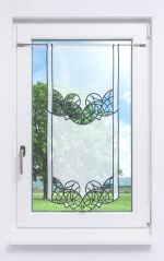 Mit einem geschwungenen bogenförmigen Abschluss, der sich als abstraktes, edel schimmerndes Muster erweist, aus verschiedenen Bögen und Kringeln besteht, sticht dieser Scheibenhänger aus Plauener Spitze® von allen anderen Gardinen hervor. Das angefügte Muster kommt hier zweimal vor, hebt sich je nach Farbgestaltung nur durch die Aussparungen und das Zusammenspiel der Linien ab. Besonders imposant wirkt es, wenn das Muster durch eine andere Farbe hervorsticht und dem gesamten Design einen außergewöhnlichen Look verleiht. Da dieser Scheibenhänger als Rapportware erhältlich ist, lassen sich mit diesem Behang vielfältige Gardinenvariationen realisieren und Stoffe verschiedener Länge, etwa die Verbindung von Schiebegardinen und Scheibengardinen, zu einer individuellen Deko zusammenstellen.