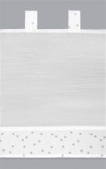 Diese Scheibengardine mit strukturierter Optik und Schlaufenaufhängung ist an den Schlaufen und am unteren Abschluss mit feinen Sternen gleicher Farbe und Größe verziert. Aufgrund des Designs mit kleinen Sternchen kann diese transparente Scheibengardine auch am Fenster im Kinderzimmer dekoriert werden, dort beispielsweise mit blickdichten Vorhängen kombiniert abwechselnd für Verdunklung und Sichtschutz oder, bei an den Seiten drapierten Vorhängen, für ein helles und lichtdurchflutetes Ambiente sorgen. Durch die dezente Gestaltung kann dieses Modell abwechslungsreich mit Farben kombiniert werden. Mit Schlaufen ausgestattet lässt sich die Scheibengardine im Nu auf eine Klemmstange aufziehen und ohne Bohren ins Fenster hängen.