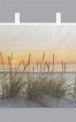Bringen Sie mit dieser Scheibengardine ein wenig Romantik und Urlaubsfeeling vor Ihre Fenster. Der aus 100 Prozent Polyester gefertigte, transparente Behang ist über die gesamte Fläche mit einem Fotomotiv bedruckt. Es zeigt ein Strandmotiv, in dessen Vordergrund einige Büschel Strandhafer im Sand zu sehen sind. Dahinter läuft die Meeresbrandung sanft in den Strand aus. Untermalt wird die Szenerie durch einen Sonnenuntergang über dem offenen Meer. Einfacher als mit dieser bei 30 Grad maschinenwaschbaren Gardine kann man sich einen solchen Meeresblick nicht nach Hause holen. Befestigt wird der Fensterschmuck mit den großen, oben am Stoff angebrachten Schleifen, die über eine separat in unserem Shop erhältliche Gardinenstange geschoben werden können.