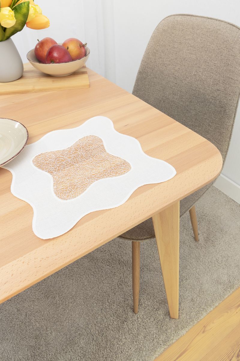 Diese Tischdeko ist in einem milden Weißton gestaltet, der hier als Ecru bezeichnet wird und den fließenden sowie luftigen Charakter der wellenförmigen Deko erneut betont. Hinzukommt, dass einige der Fäden einen edlen Bronzeton erkennen lassen. Auf einen Tisch mit schöner Holzmaserung oder einer Tischdeko mit natürlichen Elementen passt dieses Modell besonders gut. Verwandte Beige- und Brauntöne sowie sattes Rot setzen es stimmig in Szene.